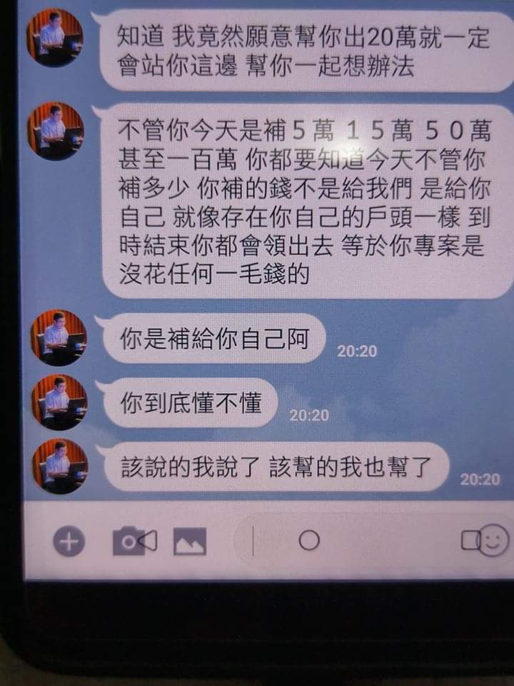 對你很好喔….跟公司爭取的40萬,教授幫你出20萬,那你自己要多轉20萬到帳號.