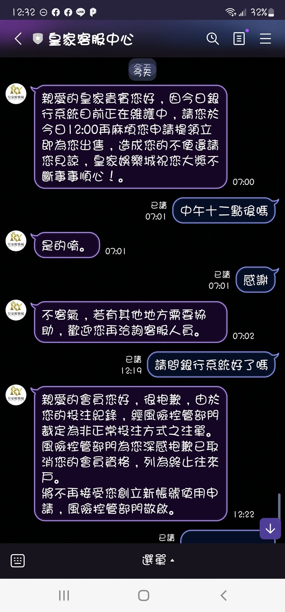 當日打DG百家打累就跑去轉魔龍傳奇,並沒有持續長時間打DG,到32萬時停止提領一半金額(早上七點多),當時皇家娛樂城表示銀行系統維護至中午12點,過了中午我詢問皇家娛樂城卻被告知我異常下注百家......,並且我的帳號直接無法登入,直至傍晚將我的本金退還給我。
