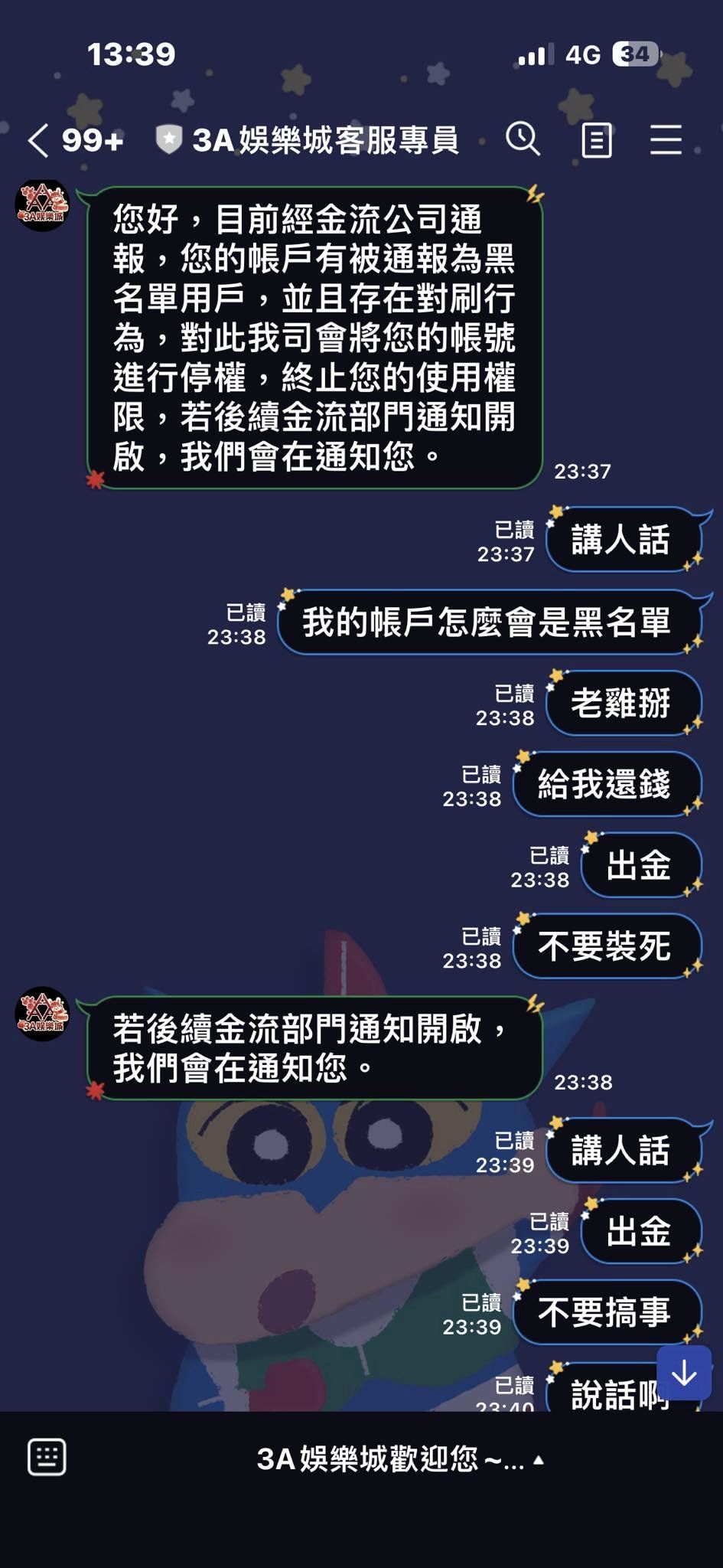 3A娛樂城惡意不出金,只會罐頭訊息回覆,不敢輸贏學人家開什麼娛樂城,呼籲大家不要投入過多本金,下場變得跟我一樣,白饅頭配開水3A娛樂城
